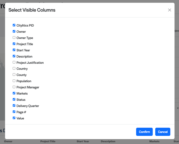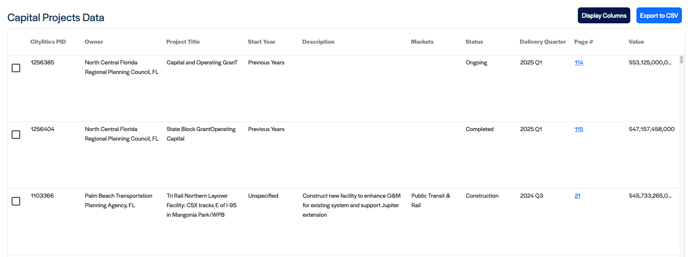 Adjust the information displayed by clicking the display columns button. This allows you to configure which data appears in your table, adding or removing relevant intelligence (e.g., project justification, owner type, county