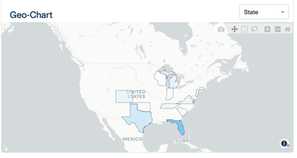 This chart shows the number of projects across states and provinces. Darker blue shades indicate more projects. The chart is interactive; click states to select or unselect them.