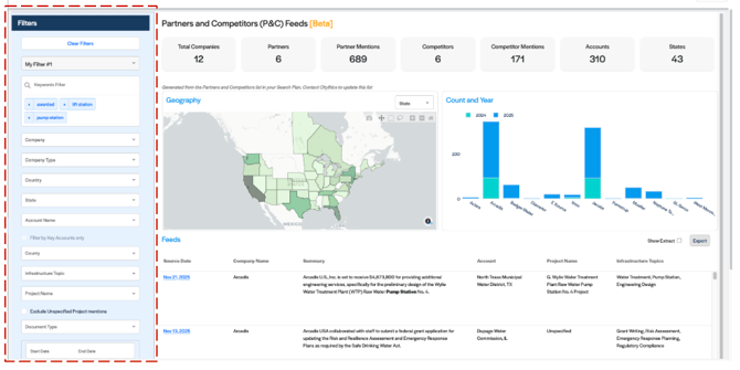 The Partners & Competitors (P&C) Feeds dashboard provides partner- and competitor-focused intelligence on recent and historical activities dating back to Jan 1, 2025. While Intelligence Feeds (IF) mainly focus on early-stage projects for lead generation, P&C Feeds capture company mentions and activities to support lead generation and qualification.
