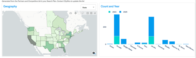 A bar chart breaking down activity by company and year, allowing you to compare year-over-year trends for specific competitors.